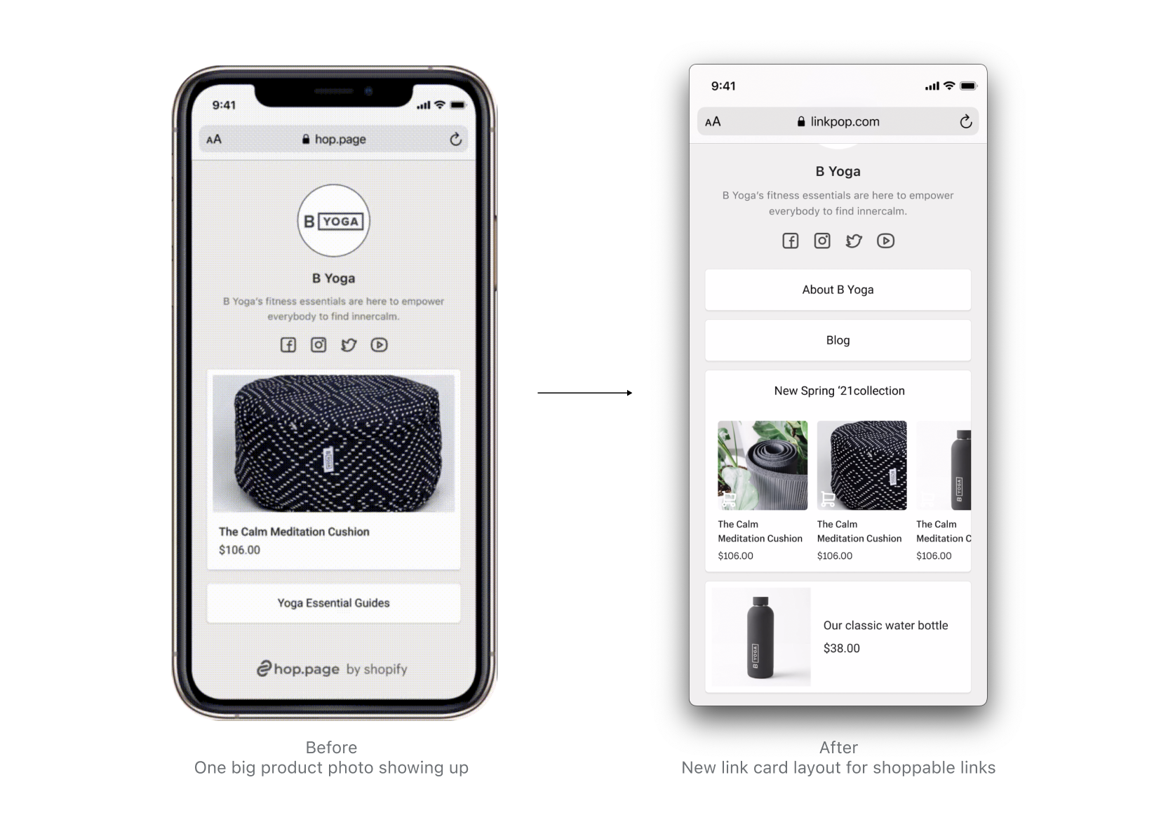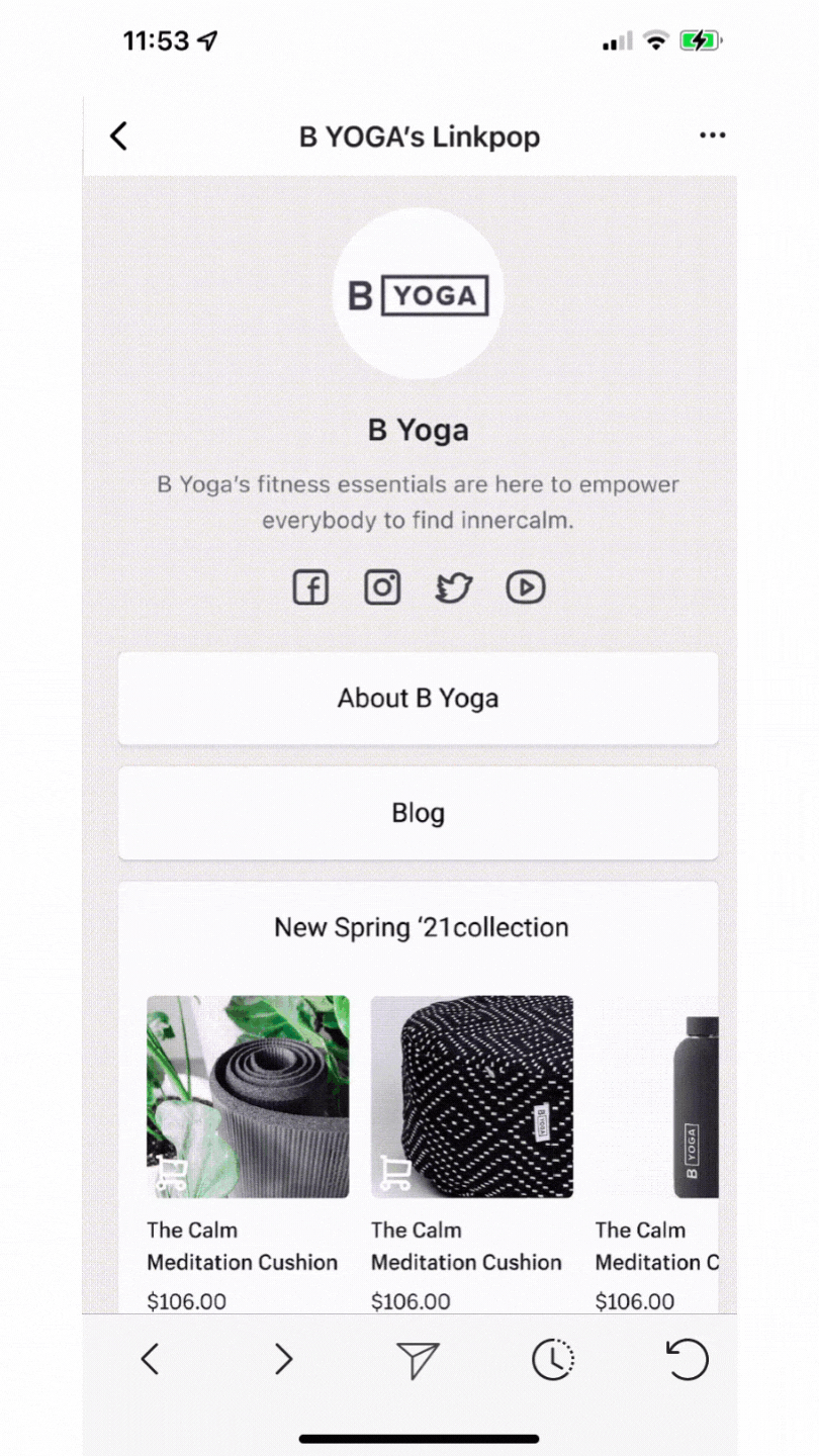 In this new proposal, instead of having only one product dominates the page, I design a new layout allows more links to be shown above the fold. Within this flow, buyers can easily browse product from different links and add products to cart so it can be checked out together.More content and products can be seen when viewer browsing through link in bio page.