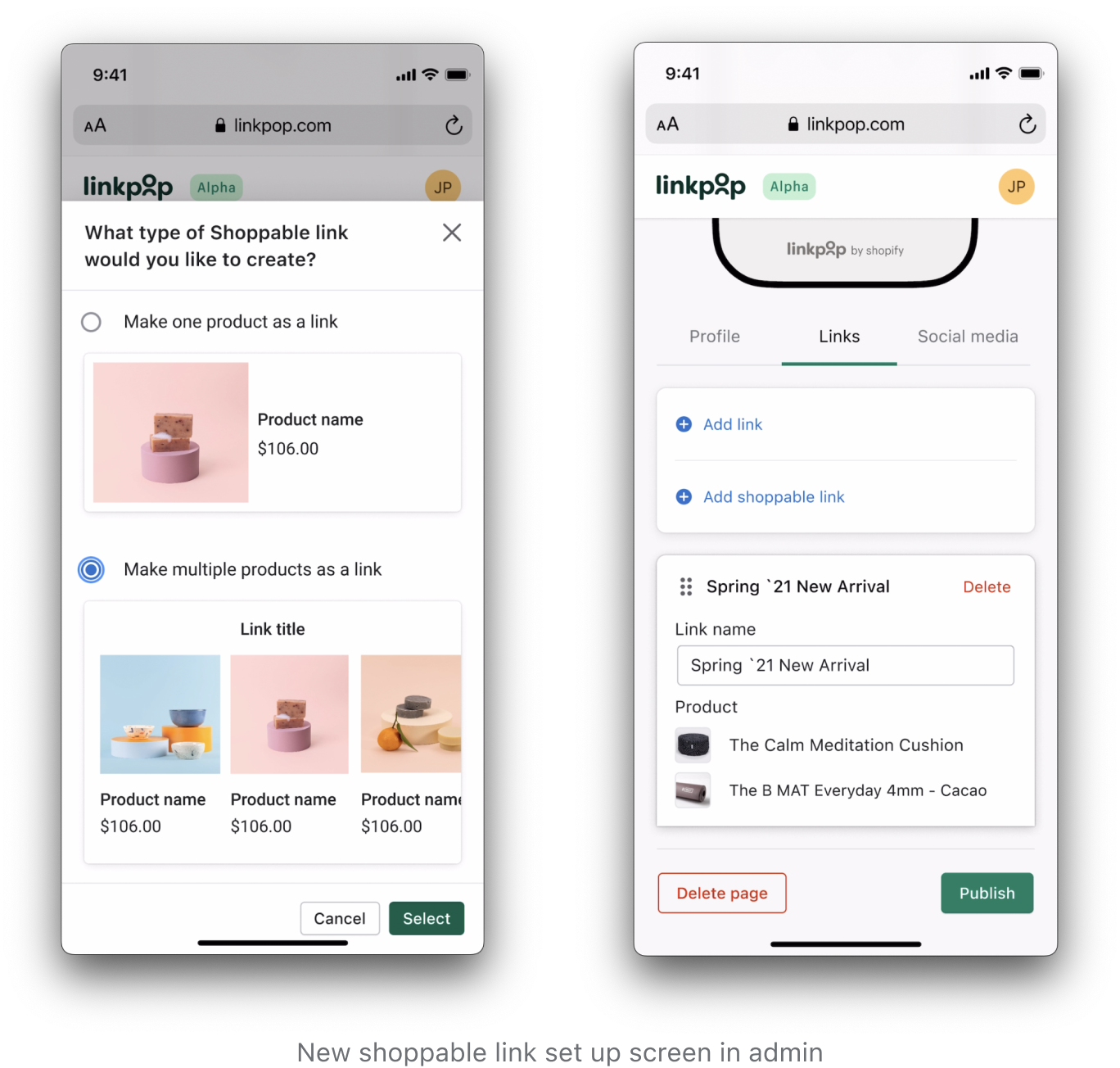 In the new design, I propose to provide options for shoppable link. When adding shoppable links, user can choose the way they want to display on the page. Make one product as a link, or make multiple products as a link.