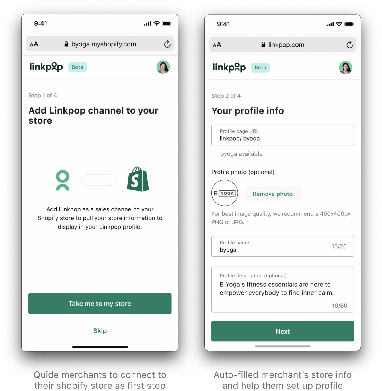 The onboarding walkthrough UI shows instructional UI and default options on the profile page creation flow. The design provides auto-filled store information by using merchant’s Shopify account. The onboarding design that auto populates store info (store name, URL, logo, etc) pulled from merchant’s Shopify admin creates a shallow learning curve that helps them to set up link in bio profile quickly.